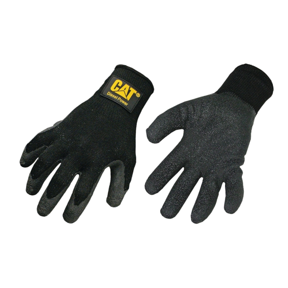 Poly cotton knit back with fully coated latex palm and fingers, knit wrist for snug fit. Cat diesel power rubber logo on wrist of each hand.