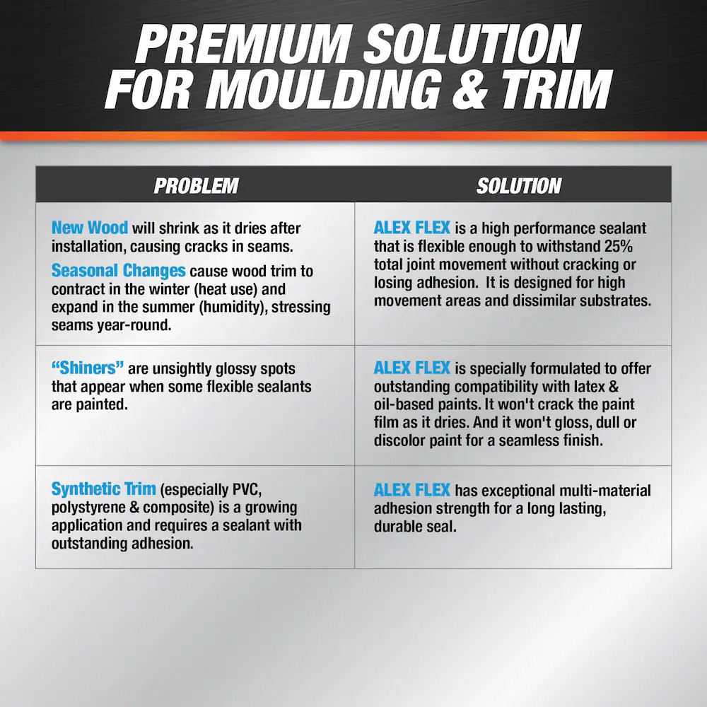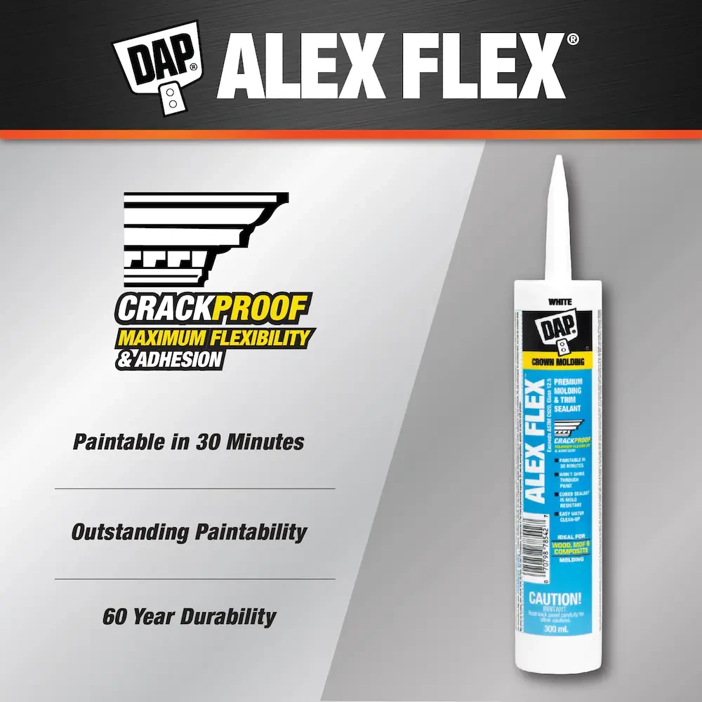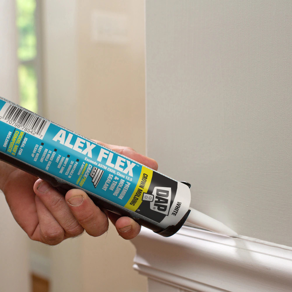 DAP® ALEX FLEX™ premium molding and trim sealant is specifically formulated for use on molding and trim applications. It delivers maximum adhesion and flexibility for a crack proof seal.