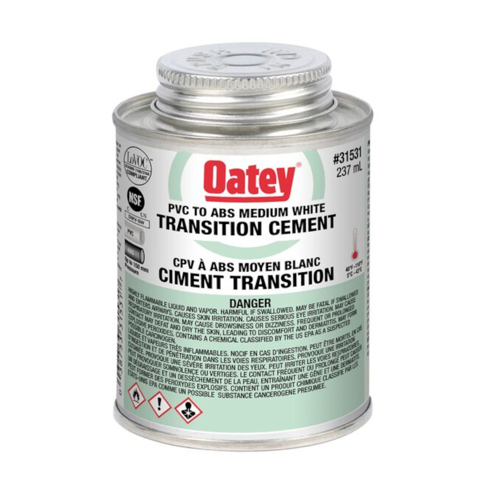 Oatey Transition Cement, Net Content: 236 mL, Liquid, Odor/Scent: Solvent, White, Compositions: Tetrahydro- Furan, Acetone, Methyl Ethyl Ketone, Polyvinyl Chloride, Cyclohexanone, Amorphous Fumed Silica, Specific Gravity: 2.5, Boiling Point: 151 deg F, Flash Point: 14 to 23 deg F, VOC Content: <510 g/L, Viscosity: 1000 to 2100 cPs, Temperature Rating: 40 to 110 deg F, Applicable Materials: ABS, PVC