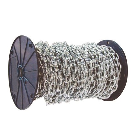 KingChain Straight Link Coil Chain is an excellent general purpose, low carbon utility chain that is easily identified by its link design. The chain is manufactured to NACM standards. Each link is proof tested two times and the break load is 4 times the Safe Work Load (design factor 4:1). Straight Link Coil Chain is recommended for applications that do not require high strength-to-weight ratios. It is typically used for tailgates, barrier guards, swing sets, hanging light fixtures and animal chains. Chain is zinc plated for a bright, attractive finish with moderate corrosion resistance. Do not use for overhead lifting. Never exceed the Safe Working Load (SWL).
