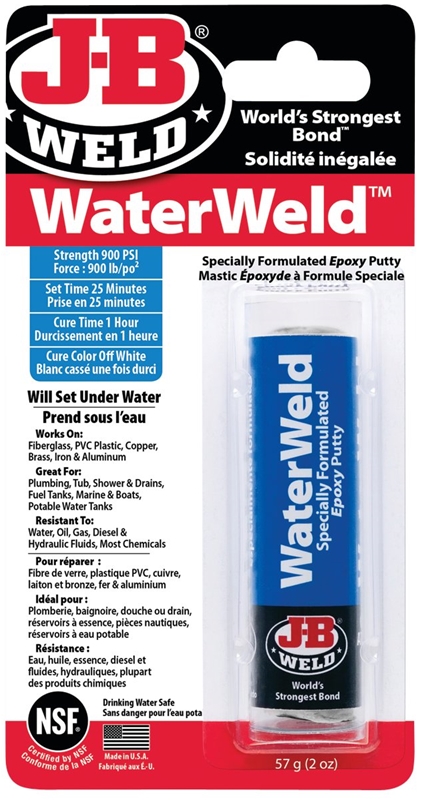 WaterWeld? will plug or seal leaks and patch holes and cracks in almost anything. Ideal for repairing plumbing, fuel tanks, tub and shower, drains, pool and spa, boats and potable water tanks. Setup occurs even under water. After curing, it can be drilled, tapped, filed, sanded and painted. WaterWeld? has a set time of 15 to 25 mins and sets hard in one hr. WaterWeld cures to an off-white color, is rated at a tensile strength of 900 psi and will withstand temperatures up to 300 deg F.