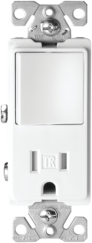 Shutter designed to prevent the insertion of foreign objects. Switch is horsepower rated for motor loads per UL 20. Thermoplastic toggle, top and backbody. Ultrasonic welding and integrated construction of the strap and body. Tri-combo screw heads. Backwire clamps on side terminals for installation of #12 and #14 AWG wire. 15 amp 120V/AC switch, 15 amp 125V/AC TR receptacle. UL listed.