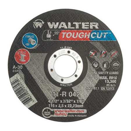 Abrasive Cut-Off Wheel, Abrasive Material Aluminum Oxide, Grit 30, Connector Size 7/8 in, Connector Type Unthreaded Hole, Overall Diameter 4 1/2 in, Overall Thickness 0.0938 in, Primary Material Applicationn Stainless Steel, Steel, Series TOUGHCUT, Wheel Type Type 1, Maximum Operating Speed 13,300 RPM.