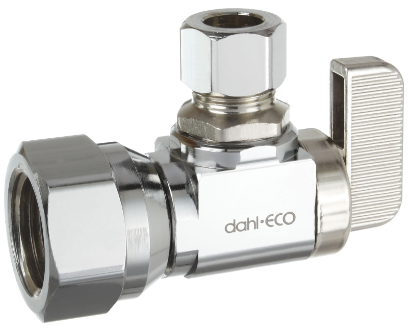 Dahl mini-ball Angle Valve, 1/2 x 3/8 in Connection, FIP x Compression Connection, 250 psi, Actuator Type: Locking Lever, Temperature Rating: 250 deg F, Softgoods Material: EPDM, FKM, PTFE, Body Material: Brass, Nickel Plated Zinc Handle, Chrome, Silver, Dimensions: 2.6 in L x 1.5 in W x 1.8 in H, Suitable for: Copper Compression Iron NPT Pipe