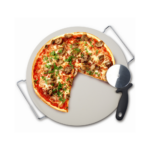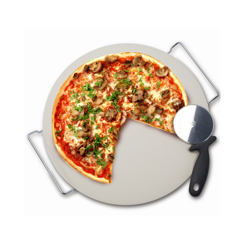 This pizza stone set includes a 14.5” natural bisque stone, a metal rack, and a cutter, perfect for baking delicious homemade pizzas. Oven safe and gift boxed, this pizza stone ensures even baking and a crispy crust. Hand wash only.