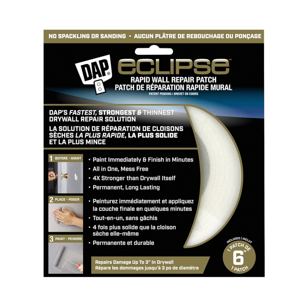 Eclipse rapid wall repair patches are a unique and innovative drywall repair solution that is ideal for completing permanent repairs on damaged walls and ceilings. No more waiting for spackling to dry or messy sanding. DAP Eclipse allows you to patch drywall damage and paint immediately, allowing you to finish your project faster. This all-in-one, mess free solution not only provides a permanent, long-lasting repair but also great impact resistance for areas that may see reoccurring impact, such as behind a door.