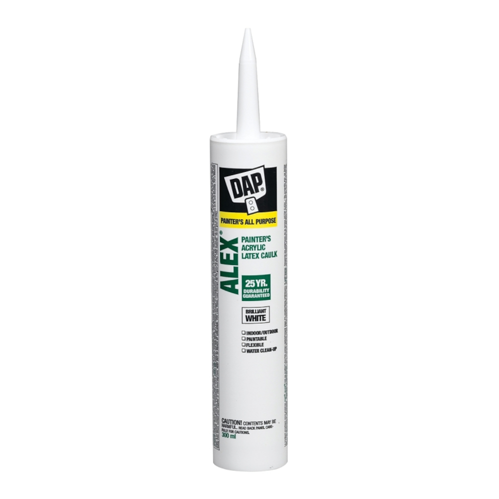 DAP® ALEX® painters acrylic latex caulk is a durable indoor and outdoor caulking product. It ensures a durable seal to prevent air and moisture from passing through cracks and joints. DAP® ALEX® painters acrylic latex caulk is paintable with latex and oil based paints and can be used for both interior and exterior applications.