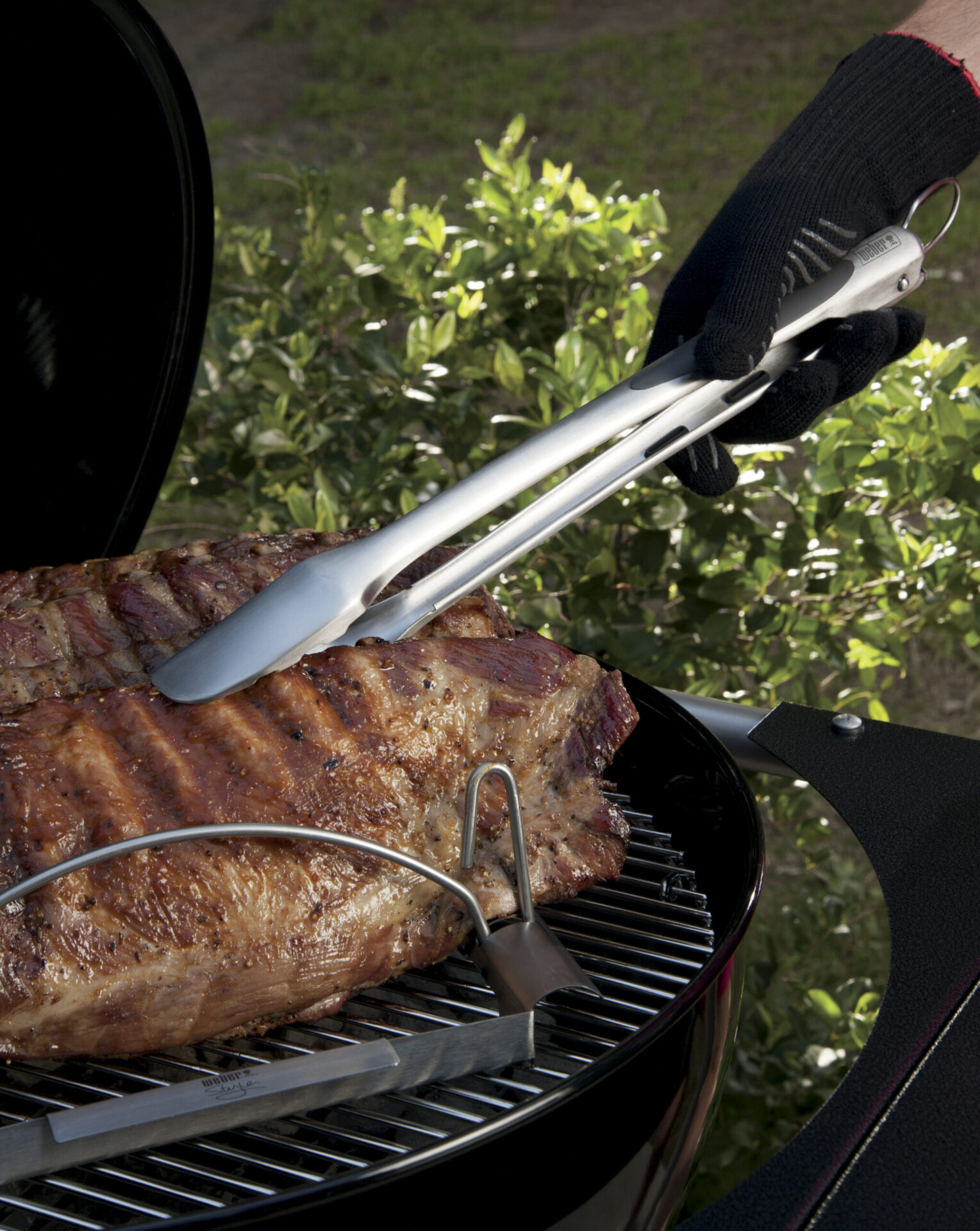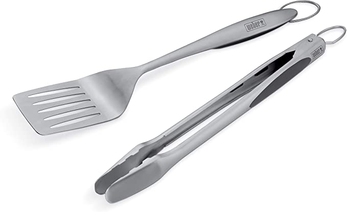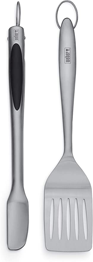 Weber Style accessories offer the perfect mix of appearance, durability and function. Includes spatula and tongs. Ergonomic designs and soft-touch grips provide excellent control. Hands-free locking tongs.