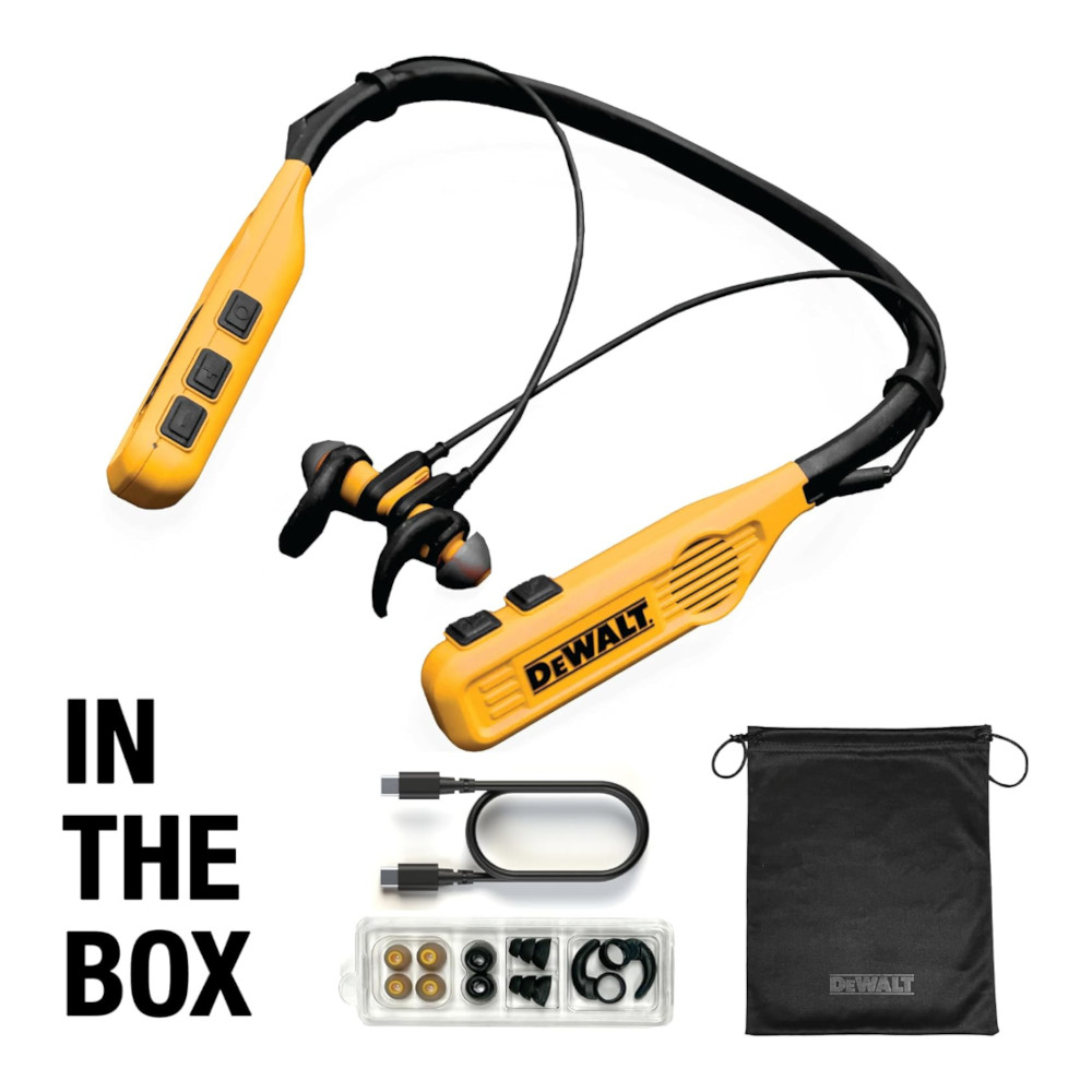 Revolutionize your audio experience on the jobsite and beyond with the innovative DEWALT 2-in-1 Speakers with Headphones. This versatile system combines wireless neckband earbuds with powerful, integrated speakers, meticulously engineered to project audio upwards for an immersive music experience, all while crucially keeping you aware of your surroundings.