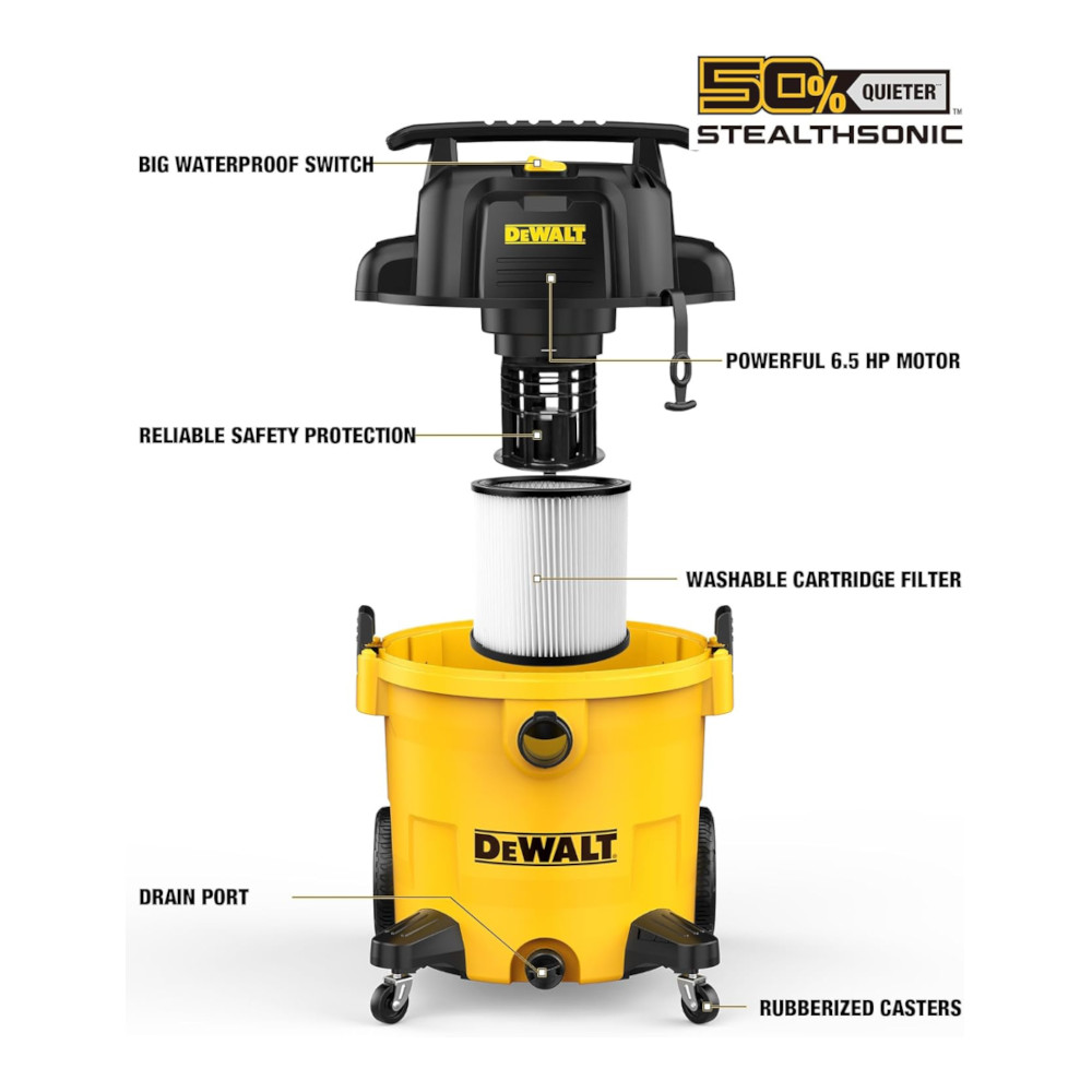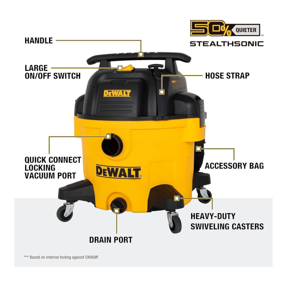 9 Gallon Wet/Dry Vacuum—Heavy-duty motor, strong suction, fine-dust filter, onboard accessory bag for jobsite cleanups.