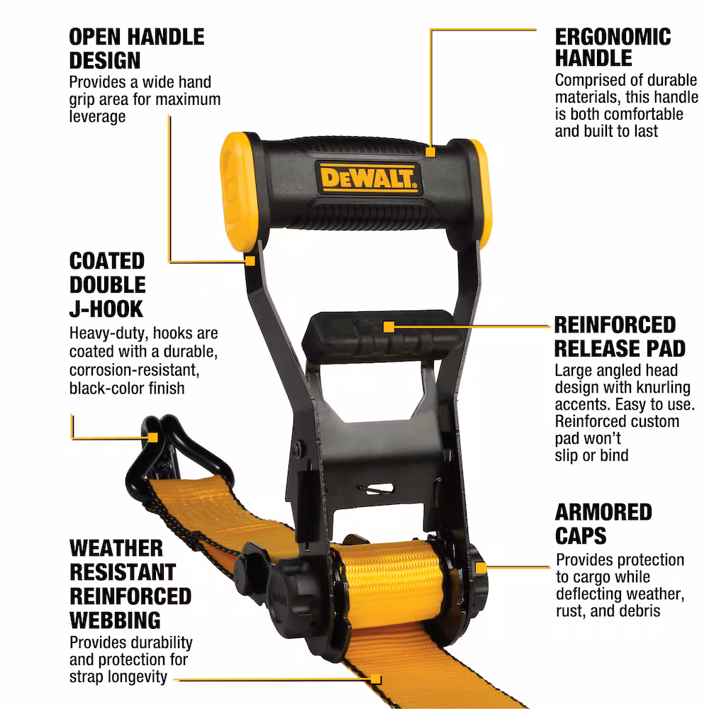 Heavy-duty DEWALT Ratchet with 10000lb break strength, reinforced side panels, and coated quick-release for secure cargo.