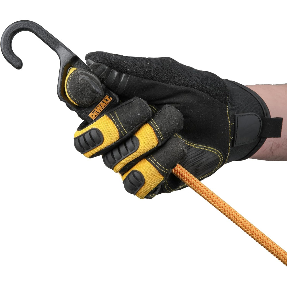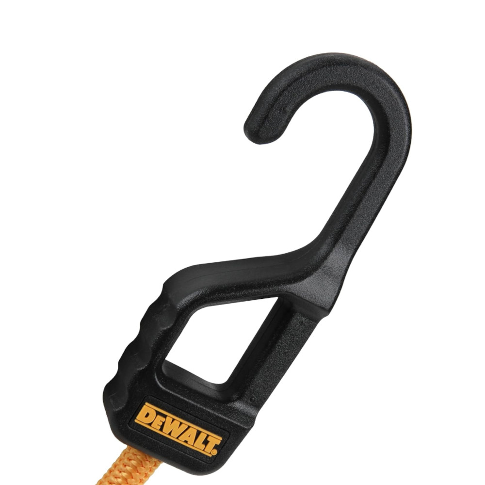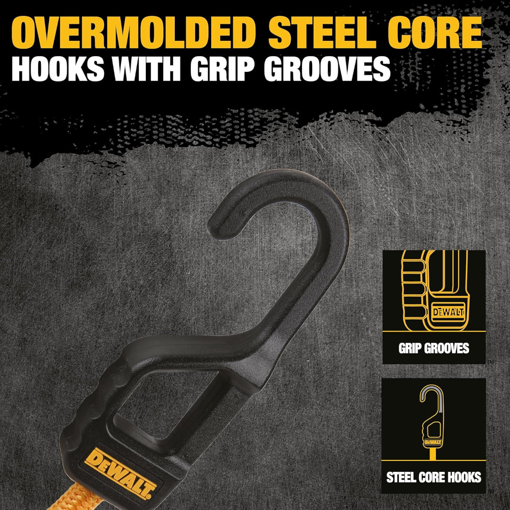 Jobsite-ready DEWALT bungees with overmolded, rust-resistant head, premium rubber core, and XL diameter for tough hauls.