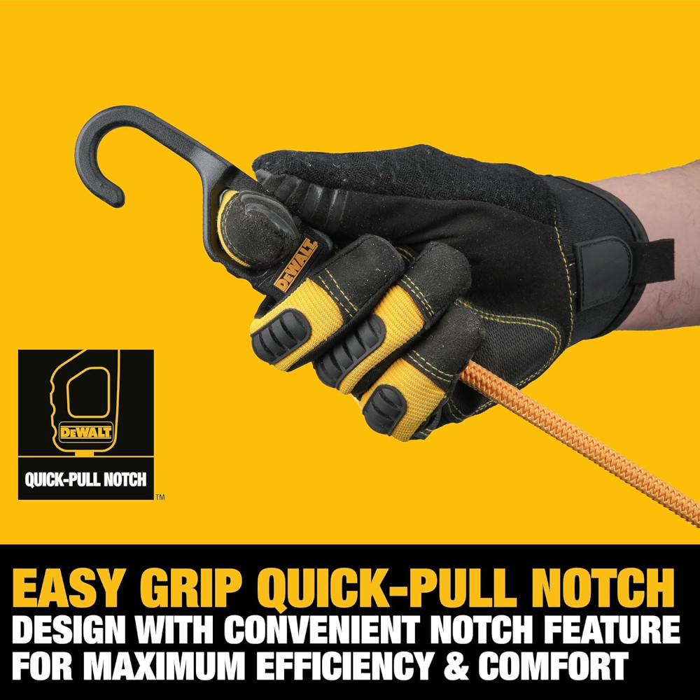 Each cord features an XL diameter round bungee cord with a premium rubber stranded core, built to work as hard as you do, offering exceptional elasticity and durability. From securing tools and equipment to recreational gear, these DEWALT premium bungees are your go-to solution for unwavering cargo control.