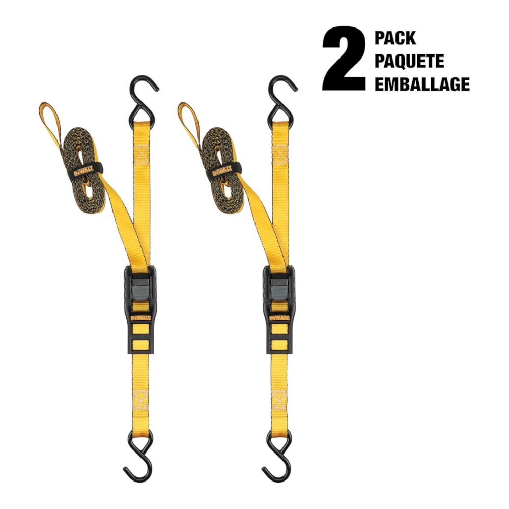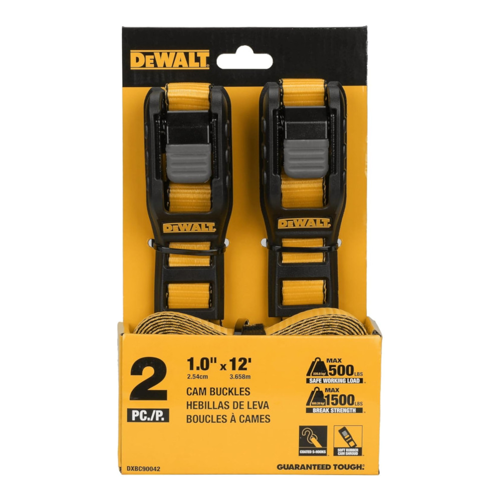 Secure cargo safely with DEWALT’s 1,500 lbs cam buckle straps—heavy-gauge steel, non-marring, and quick tension adjustments.