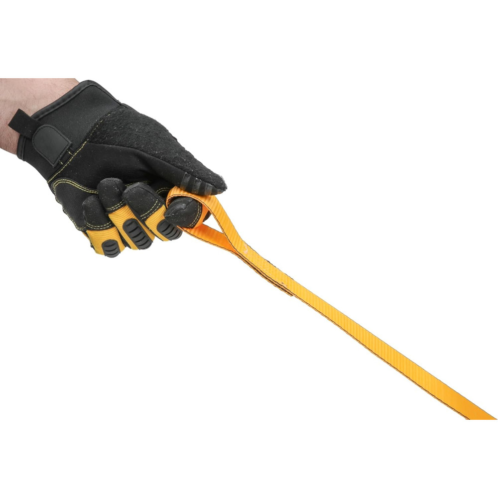 Our highly visible, pre-threaded, weather-resistant, and wear-resistant straps are always ready for immediate use, eliminating fumbling and saving you precious time. A thoughtfully designed sewn-in pull loop offers a convenient, ergonomic grip for tensioning down your cargo, ensuring a rock-solid hold without any damage. Plus, the included hook-and-loop storage strap keeps any excess webbing neatly organized and under control, preventing tangles and snags. This is DEWALT. GUARANTEED TOUGH.
