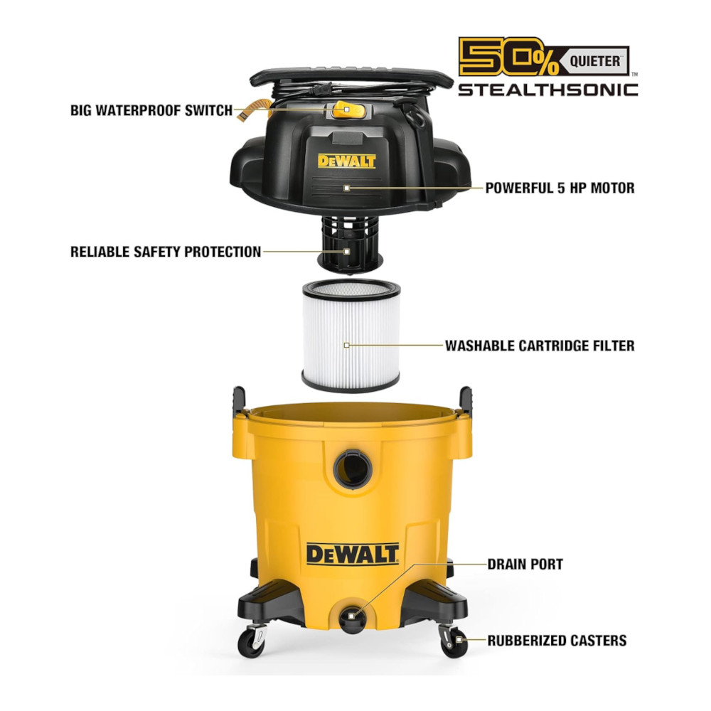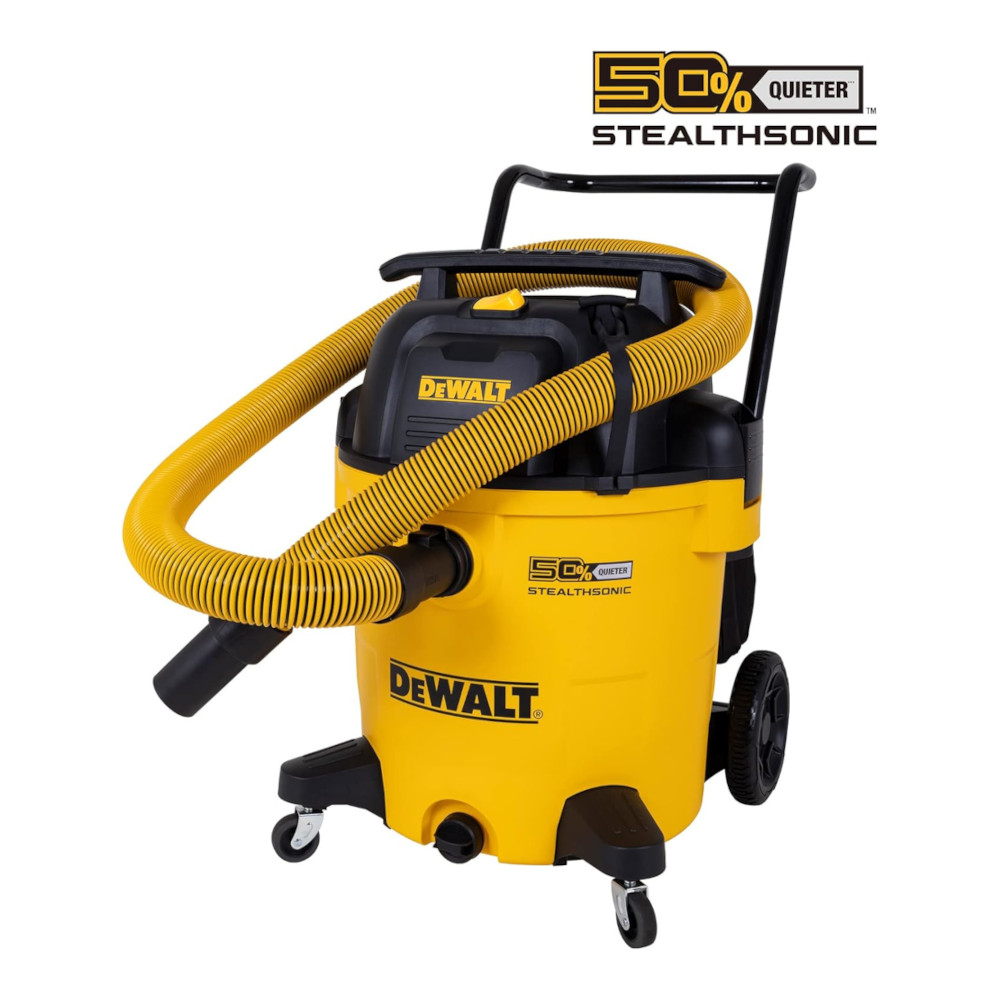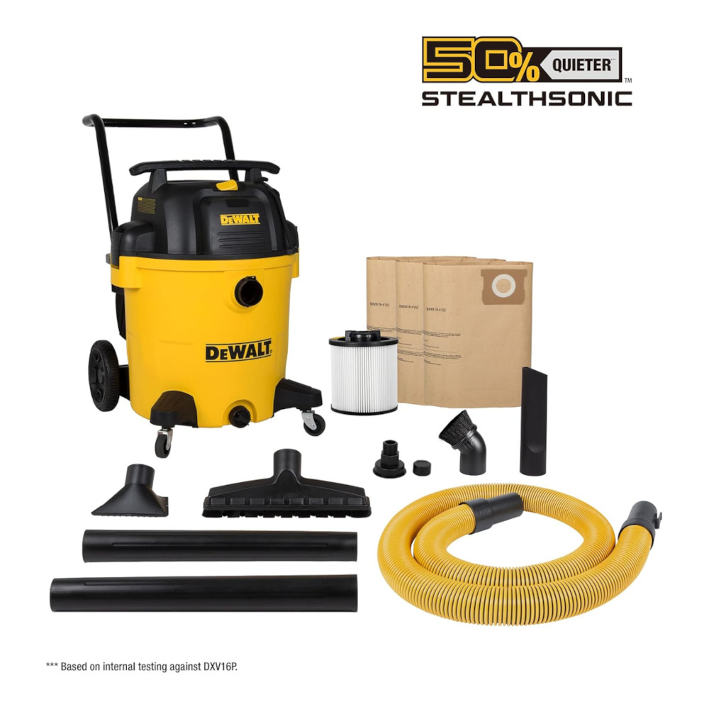 DEWALT 16-Gallon STEALTHSONIC Wet & Dry Vac—6.5 HP, 135 CFM, 50% quieter, large capacity with compact design.