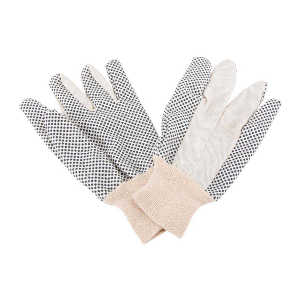 Men’s cotton work gloves feature PVC dots, straight thumb, knit wrist cuff, 80% cotton 20% polyester fabric. One size fits all.