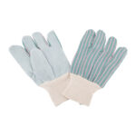 Leather palm work gloves feature cowsplit palm, clute cut color striped cotton back gloves and knit wrist to keep out dirt.