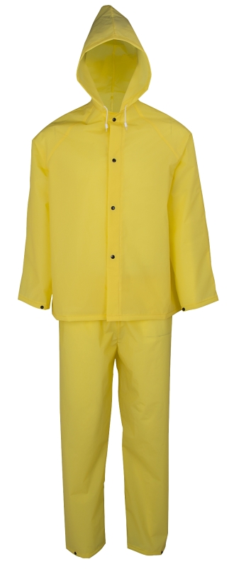 Diamondback Rain Suit, XL, Fits to Chest Size: 56 in, Fits to Waist Size: 50 in, EVA, Yellow, Collar Type: Hooded, Sleeve Type: Adjustable Cuffs, Cuff Type: Adjustable, Seam Type: Heal Sealed, Snap Down Storm Flap Closure, Length Type: Over-Waist, Inseam Length: 43 in, 33 in L, Resists: Water, Includes: Grommeted PVC Bag, Insert