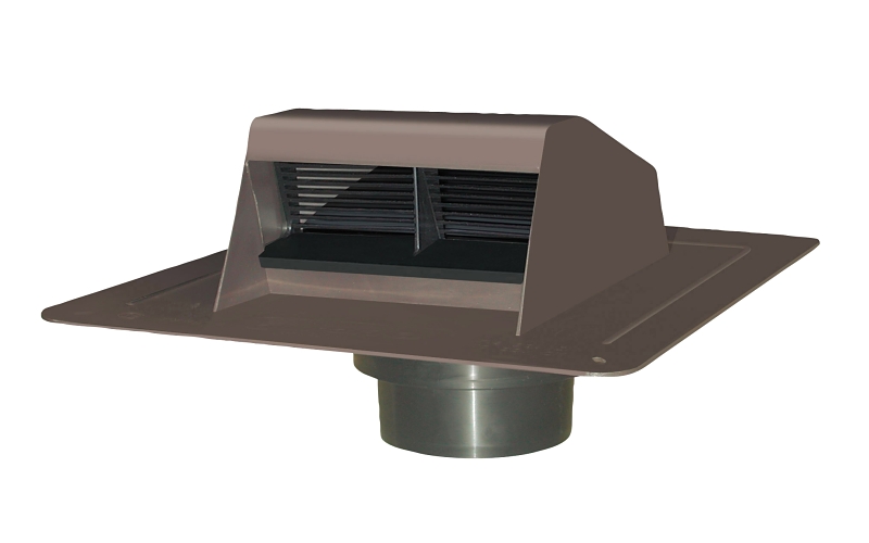 Installed on a sloped, shingled roof to exhaust bathroom fans by the means of a roof penetration. Includes internal damper to reduce backdraft and an exterior grill to prevent the infiltration and nesting of birds, vermin and insects.