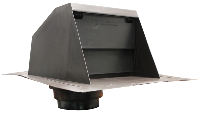 Installed on a sloped, shingled roof to exhaust range hood fans by the means of a roof penetration. Includes internal damper to reduce backdraft and an exterior dual flapper to prevent the infiltration and nesting of birds, vermin and insects.