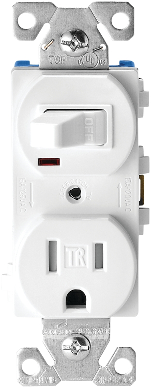 Traditional heavy-duty-grade combination switch with receptacle features UL listed tamper-resistant shutters designed to prevent the insertion of foreign objects. TR274 features a neon pilot light which is On when switch is On. Switch is horsepower-rated for motor loads per UL 20. Thermoplastic toggle, top and backbody are virtually unbreakable to deliver years of durable performance. Ultrasonic welding and integrated construction of the strap and body provide excellent ground integrity even under heavy use. Durable, injection molded housings and PVC resin comply with UL94 V0 flammability ratings. Tri-combo screw heads offer greater installation flexibility.