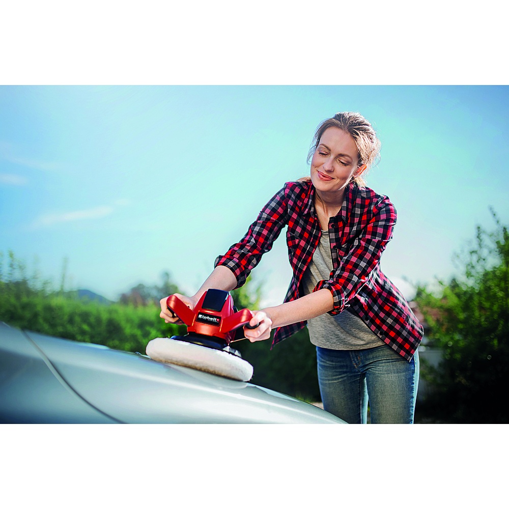 Use the Einhell 2093303 (CE-CB 18/254 Li) 10″ (254 mm) cordless car polisher to quickly polish your car to a mirror finish. The secret: Flexibility with freedom to maneuver while working, thanks to operation with a high-performance Lithium-Ion rechargeable battery. The battery is a member of the innovative Power X-Change family from Einhell and can be used in all the devices from the system series. For a long service life, the polisher is user-friendly and robust in design, while the softgrip contributes to comfortable operation with minimum strain and a perfectly firm hold. It is well balanced and while heavy enough to perform, it is light enough for prolonged use. The powerful 2,500 RPM and the polishing disk with a diameter of 10″ (254 mm) make it a highly effective tool for polishing and sprucing up vehicles, buffing furniture or your live edge projects. For safety purpose, there is an easily accessible On/Off switch and overload protection. First, the polishing agent is applied to the paint surface with the textile polishing bonnet. Then, the synthetic polishing bonnet is used to produce a long-lasting shine. The polishing bonnets are included with the tool. For optimum results, the use of the 2.0 Ah, 2.5 Ah Einhell rechargeable battery or higher is recommended. Battery and charger sold separately.
