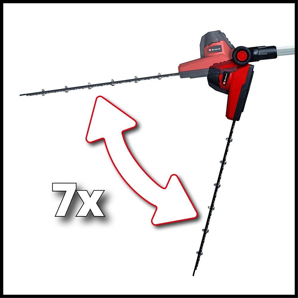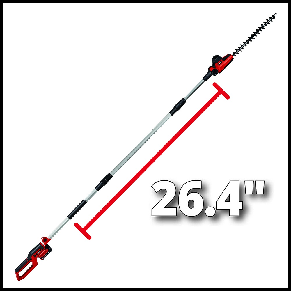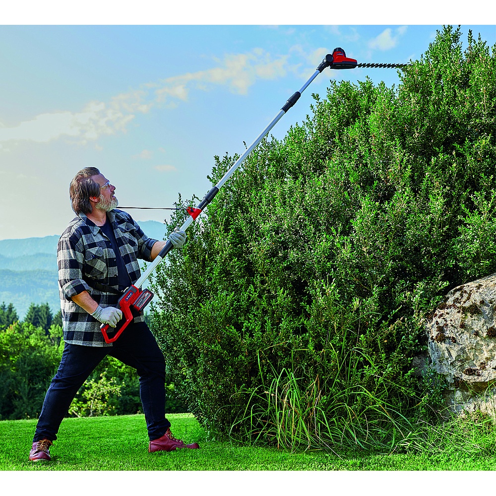 The Einhell Cordless Pole Hedge Trimmer is a member of the flexible and high-performance Power X-Change family from Einhell. Its high-grade rechargeable batteries with their Lithium-Ion cells can be combined with every system device within the PXC family. The blades on the pole hedge trimmer are made of laser-cut and diamond-ground steel. Flexibility is owed to a motor head with 7 tilt settings and a swiveling main handle. There is an additional rubberized holding area that provides a firm and secure grip, as well as a harness that also promotes ergonomic handling. The robust metal gearing is designed for a long service life. This pole hedge trimmer comes with an extension pole (26.4″ long) so that it can also be used on higher hedges. A sturdy cutter guard is supplied for safe storage and easy transport. This product comes without a battery and without a charger; these items are available separately, e.g. as a practical starter set.