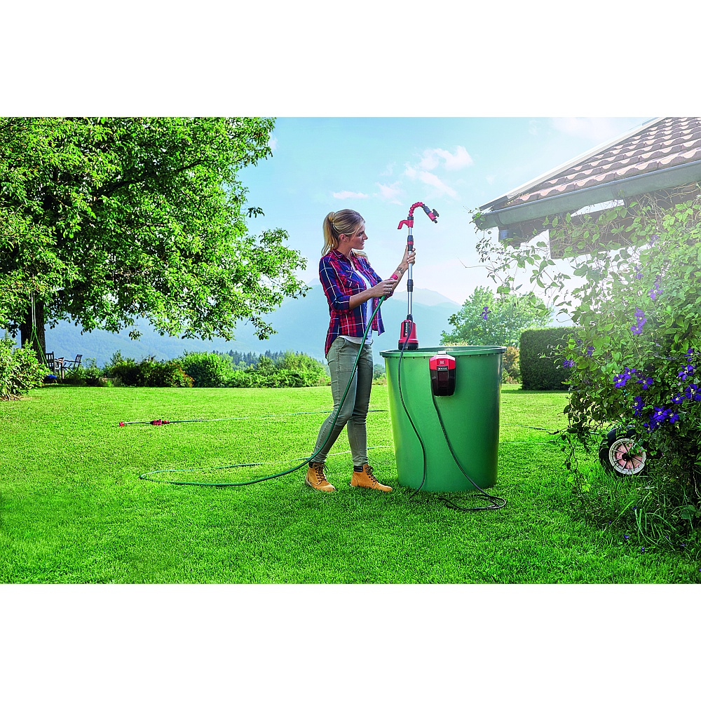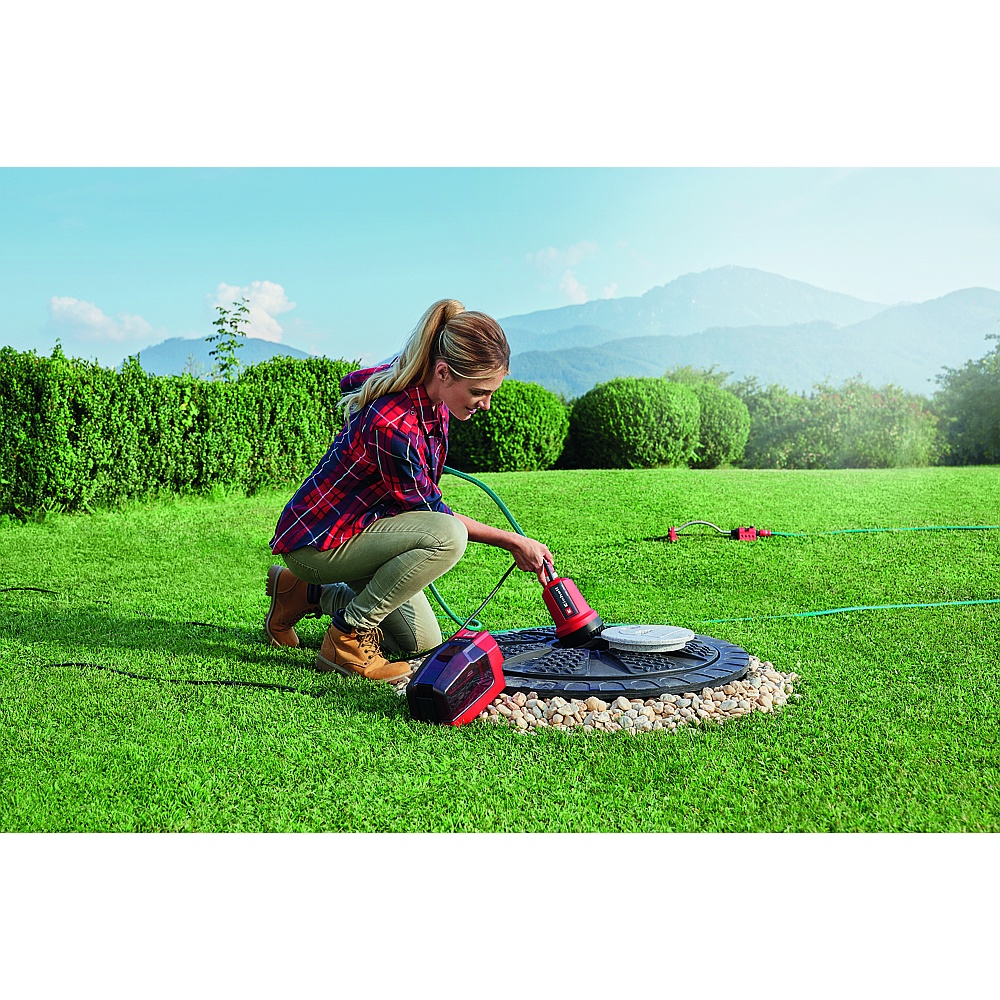 The Einhell cordless clean water rain barrel submersible pump 4170427 is a powerful member of the high-quality lithium-ion-powered Power X-Change family. The pump is designed for a range of applications. Use as a submersible pump with a long cable connection, e.g. in a tank or well, or with the adjustable connecting pipe, e.g. for a rain barrel: Water your garden without needing a power source – flexible in application and powerful in operation. The powerful motor generates a high delivery pressure of more than 29 PSI, which means running a lawn sprinkler or a garden sprayer is no problem at all. The extension tube with its convenient mounting bracket and movable water connection with stop valve for custom positioning of the garden hose, is telescopic. The separate, splash-proof battery box with hanger and wall mount is equipped with a convenient option to store the cable on the housing. The high-quality pump body and the battery box are made of impact-resistant plastic. One 18V Power X-Change battery, which is not included, is required for operation. The battery and charger are not included and are available separately.
