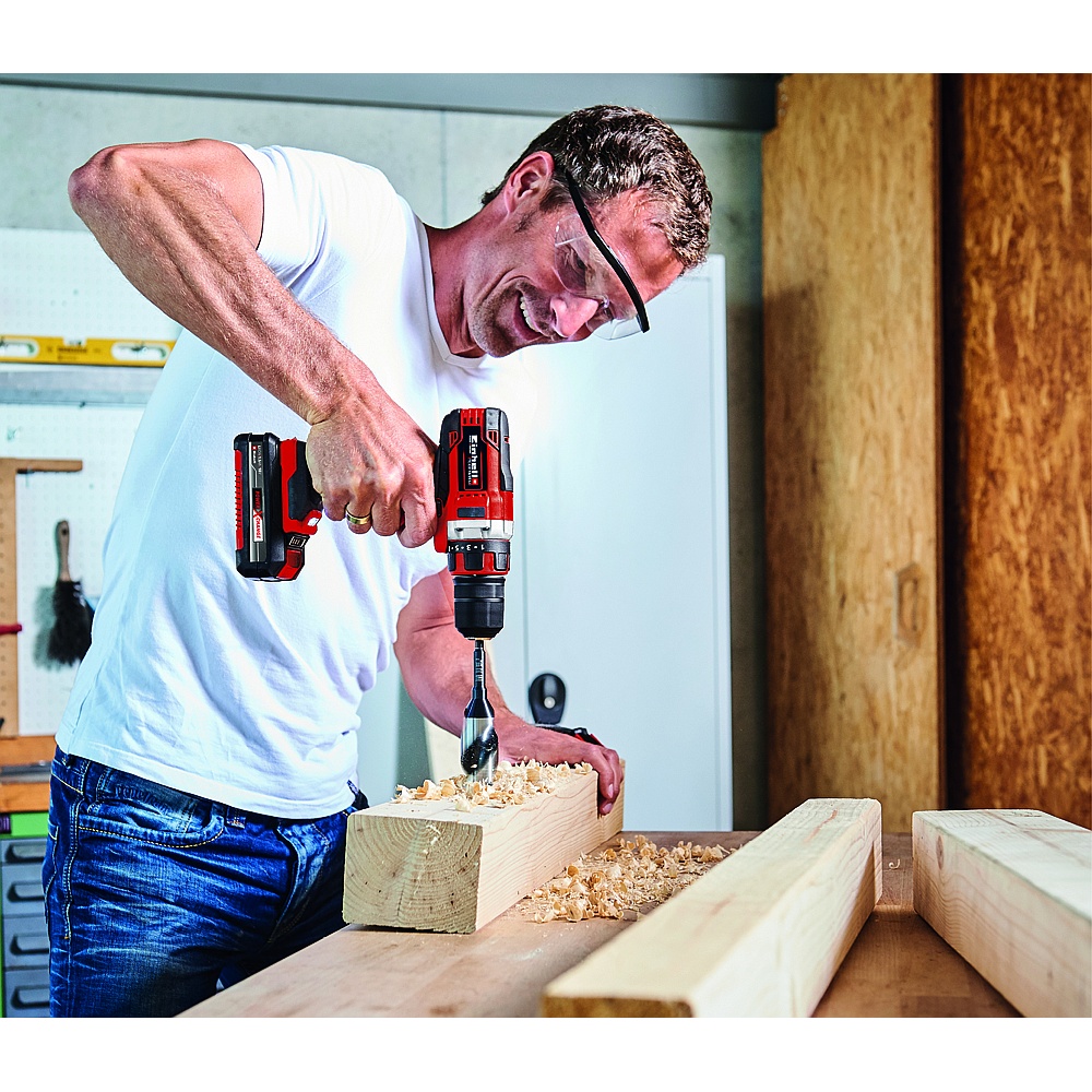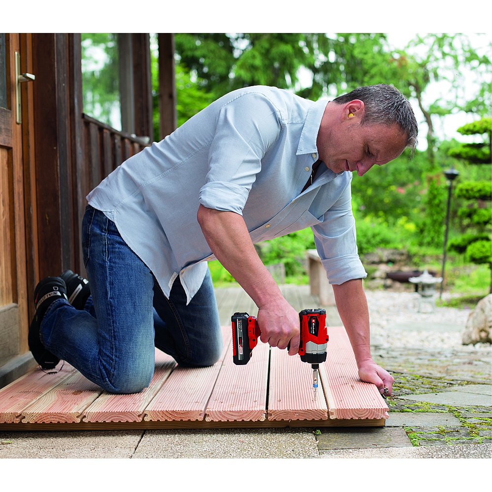The Einhell 4513945 (TE-CD 18/40-1 Li (2×2.0Ah)) cordless drill and the 46100 60 (TE-CI 18/1 Li) cordless impact driver are high-power members of the flexible Power X-Change series. The cordless drill has a robust 2-speed gearing for powerful drilling and screwdriving, yet for all its power, the electronic speed control with 20 + 1 torque settings ensures that the tool can still be adjusted to the specific material and application. The variable speed ranges of 0 – 400 and 0 – 1,500 RPM, make this a truly versatile tool. The single-sleeve 13 mm (1/2″) drill chuck makes it easy to fit drills and bits. Exceptionally easy handling and a firm, secure grip is offered by the ergonomic design and soft grip. For optimum visibility in the work area there is an integrated LED light. With 140 Nm (1,240 po/lb / 103 pi/lb) the cordless impact driver not only effortlessly drives in large or long screws, it tackles detailed screwdriving jobs too: the cordless impact driver is suitable for a whole range of jobs in the home, the workshop and the garage. Unlike other impact drill drivers, the impact driver from Einhell helps reduce physical strain on the user: the low reverse torque ensures that less effort is required. The same battery for everything, a concept which means lots of other tools can also be operated with the same battery. Thanks to its short, light-weight design and ergonomic Softgrip surfaces, tireless working is assured. The Einhell 4510060 (TE-CI 18/1 Li) cordless impact driver is equipped with 1/4″ (6.35mm) Hexagon Fitting for optimum operation with impact-resistant bits. The idling speed is 0 – 2,300 RPM. The electronic speed control is finely adjustable for delicate operation. With the three power LED, Einhell has designed a tool which provides good all-around illumination. An aluminium housing and rubber supports protect the housing and help make it a rugged tool. A practical belt clip is provided for efficient and safe operation.