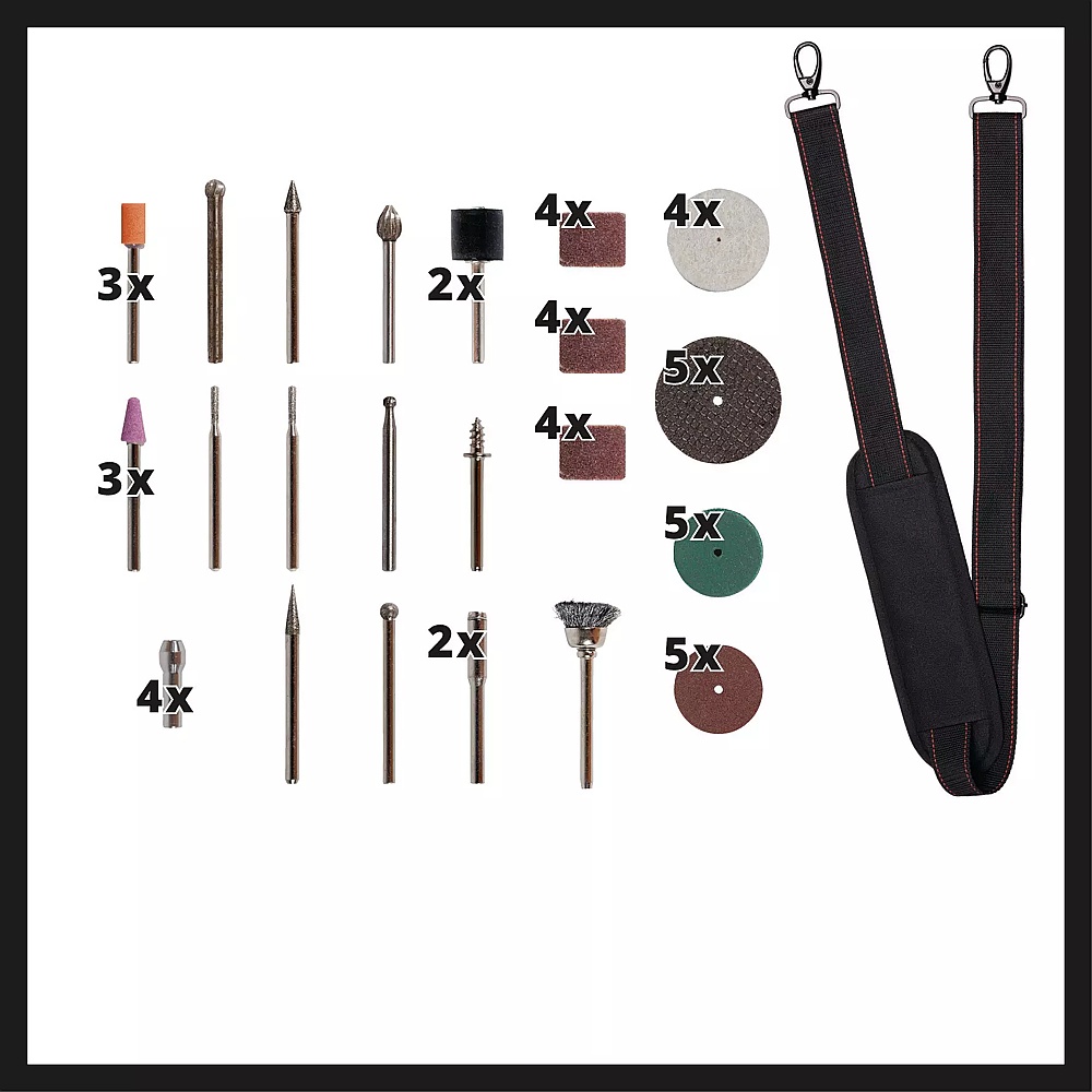 The versatile Einhell cordless rotary tool station 4419370 (TE-MT 18/34 Li) can be used for a wide range of tasks such as engraving, polishing, milling, grinding, cutting and brushing. The cordless rotary tool station is part of the Einhell Power X-Change family, where all batteries, chargers and system devices can be flexibly combined. With electronic variable speed, the output can be adapted to any situation and any material – at speeds of 5,000 to 34,000 RPM. The locking knob allows simple and comfortable tool change. Precise results, even for detailed tasks or elaborate engravings, are possible thanks to the pin on the 36″ (914 mm) long, flexible shaft. The engraving pin sits optimally in the hand thanks to its narrow design with softgrip surfaces. The station of the rotary tool includes a practical holder for the shaft and pen, as well as an accessories holder for frequently used accessories and a removable accessories box attached to the housing. Depending on the task, the station can be worn directly on the body with the 59″ (150 cm) long shoulder strap, hung up using a wall bracket to save space or placed securely thanks to rubberized feet. Delivery also includes an extensive, 57-piece accessory kit, with which there are hardly any limits to universal applications of all kinds. For optimum results, the use of the 2.5 Ah Einhell rechargeable battery or higher is recommended. Battery and charger sold separately.