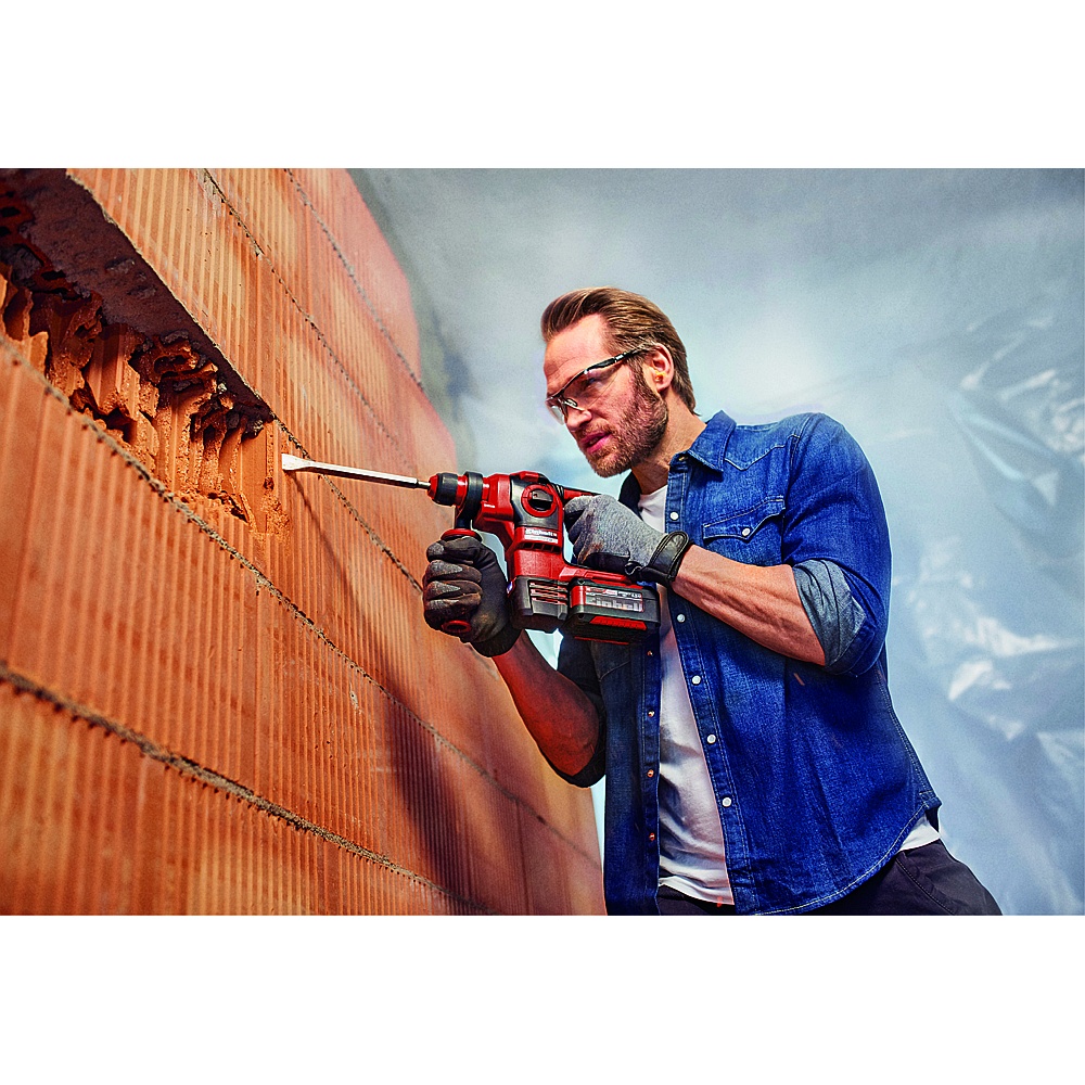 The Einhell 3/4″ (19 mm) SDS-Plus cordless rotary hammer 4513906 (HEROCCO 18/20) is a robust performer: for drilling, hammer drilling or chiseling with or without lock, the cordless rotary hammer is a valued asset in your tool kit. The brushless motor delivers more power and provides longer operation. Designed as a member of the Power X-Change family, all the rechargeable batteries in the system series can be used without restriction in the workshop and garden tools from the system series. The impact mechanism, which has a frequency of up to 5,500 impacts per minute, makes effortless work of drilling even into concrete – with a impact power of 1.6 ft/lbs and a drilling capacity in concrete of 3/4″ (19 mm). Drill bits and chisels can be changed quickly thanks to the universal SDS-plus tool chuck. The variable speed trigger is finely adjustable for sensitive operation. For comfortable and tireless operation, the grip area is ergonomically designed with a softgrip and there is an isolation gasket to cushion vibration to the handle. The LED light provides optimum illumination for the work area. The product is supplied with a magnetic bit adapter and a storage E-case. For optimum results, the use of the 4.0 Ah Einhell rechargeable battery or higher is recommended. Battery and charger sold separately.