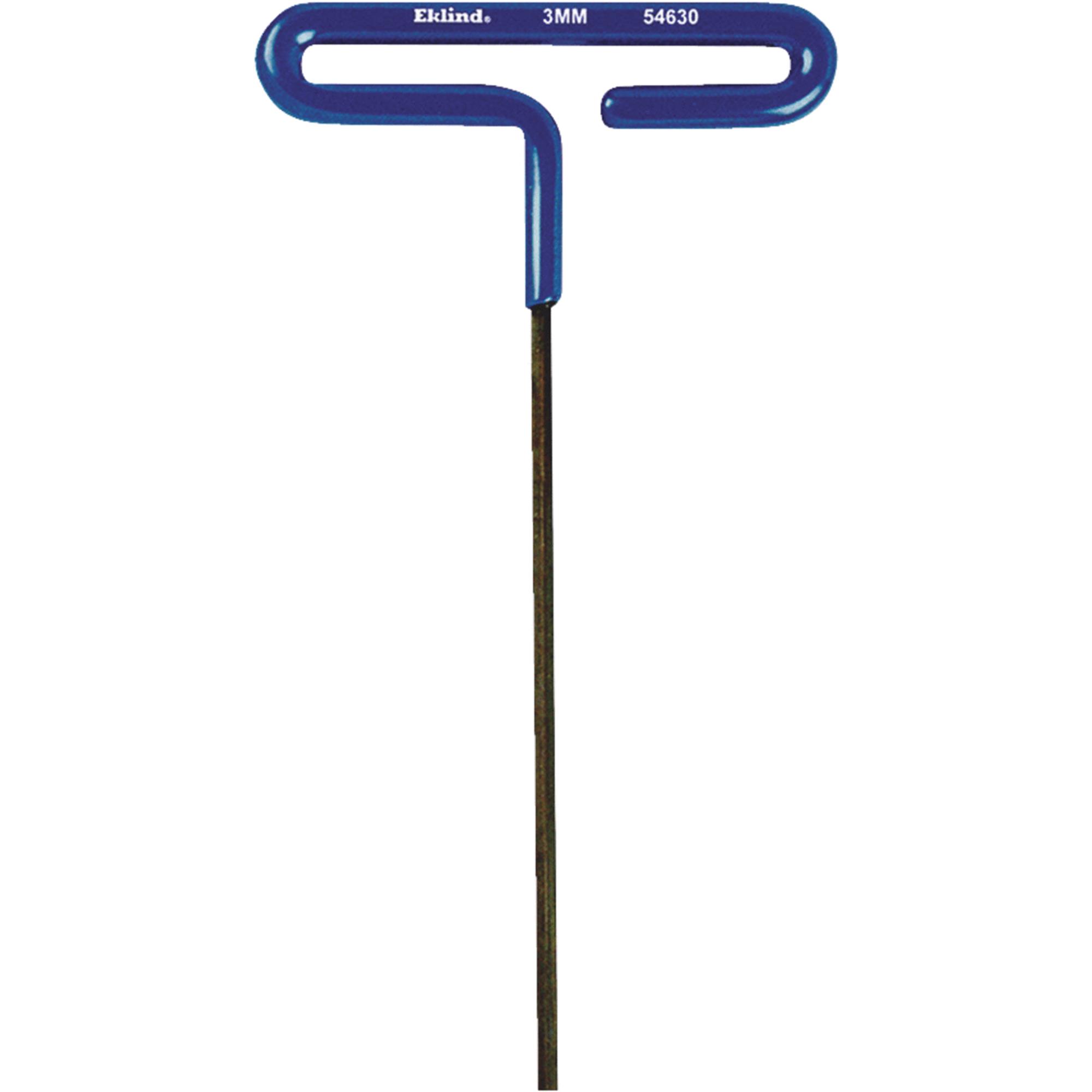 Individual Cushion Grip Hex T-Keys 3 mm 6 in Long Black Oxide Eklind Tool Individual Cushion Grip Hex T-Keys Length [Nom]: 6 in Tip Size [Nom]: 3 mm Handle Color: Blue Width [Nom]: 3 in Finish: Black Oxide Handle Type: T-Handle Tip Type: Hex Wt.: 0.07 lb Material: Steel Measuring System: Metric.