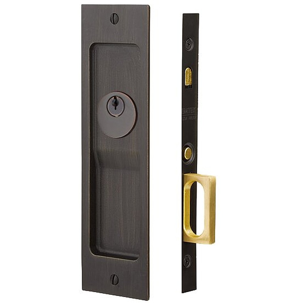 Emtek’s Rustic Modern Pocket Door Mortise Locks offer a clean and modern look in our rustic Sandcast Bronze material. The Rustic Modern Pocket Door Mortise Lock series is available in a keyed, privacy, passage or dummy function, and the sturdy mortise lock body includes a push button to eject an easy-to-grab pull.