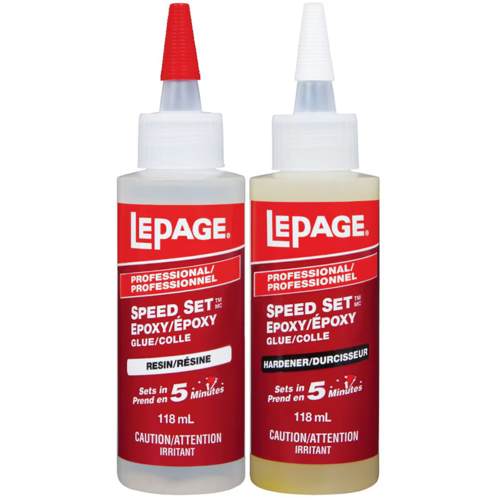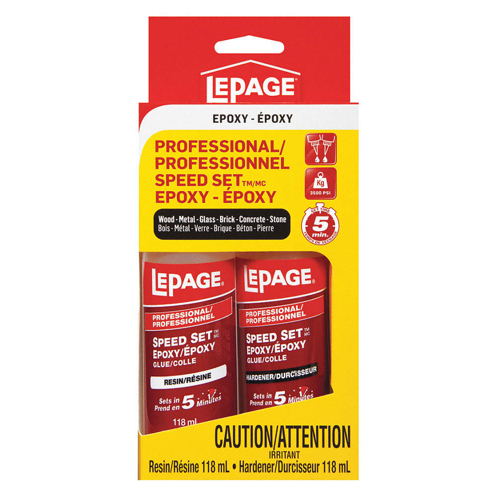 LePage Speed Set Professional Epoxy Glue is a two-part adhesive consisting of an epoxy resin and a hardener. When mixed in equal volumes, resin and hardener react to produce a tough, rigid, high strength bond in 5 minutes for most projects. It can be used as an adhesive for a wide range of materials or as a versatile filler for gap bonding, surface repairs and laminating. LePage Speed Set Professional Epoxy Glue does not shrink and is resistant to water and most common solvents. It can be tinted with earth pigments, cement or sand for colour matching. It can be sanded and drilled.