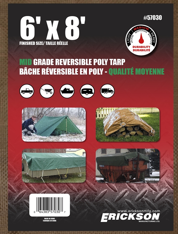 Erickson 57030 Mid-Grade Tarp, 8 ft L, 6 ft W, Poly, Brown/Green