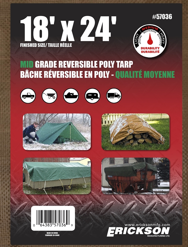 Erickson 57036 Reversible Tarp, 18 ft L, 24 ft W, 5 mm Thick, HDPE, Brown/Green