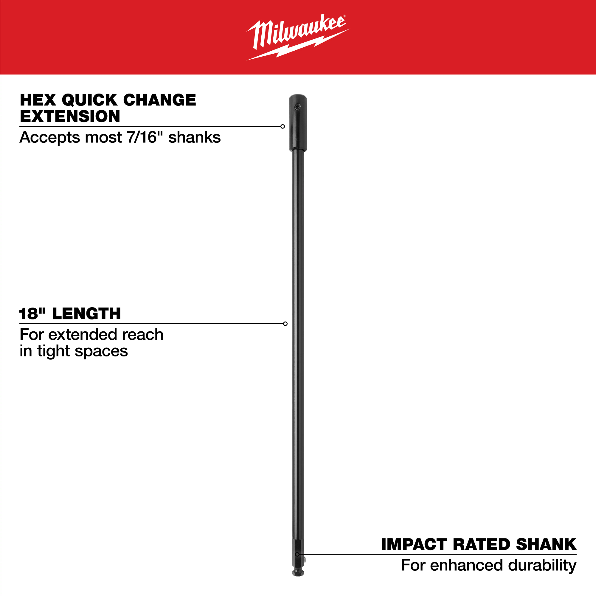 Extend your reach by 18 in. when drilling with Milwaukee Selfeed bits, auger bits and hole saws. The quick change shank is 7/16 in. hex. The 7/16 in. hex fits both 3 jawed chucks, 1/2 in. drill capacity and larger, as well as 7/16 in. quick change chucks.