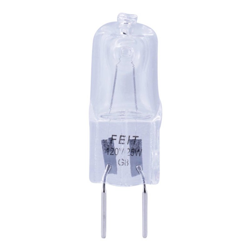 Feit Electric Halogen Bulb, Wattage Rating: 25 W, 120 V, Lamp Base: G8, Lamp Shape: JCD T4, Lamp Finish: Clear, Dimmable: Dimmable, Color Temperature: 3000 K, Average Life: 2000 hr, Dimensions: 1.8 in L, Incandescent Equivalent: 25 W