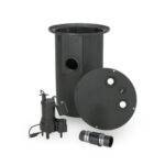 The basin includes grommets sized to accept 4″ PVC inlet, 2″ PVC discharge, and a vent connection, and the system can handle solids up to 2″.