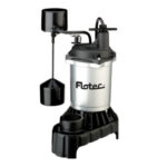 Heavy-duty submersible sump pump with 1/3 HP performance, cast iron base, zinc motor housing, thermal overload protection, vertical float switch for smaller basins, and Smooth Flow Hydraulics.