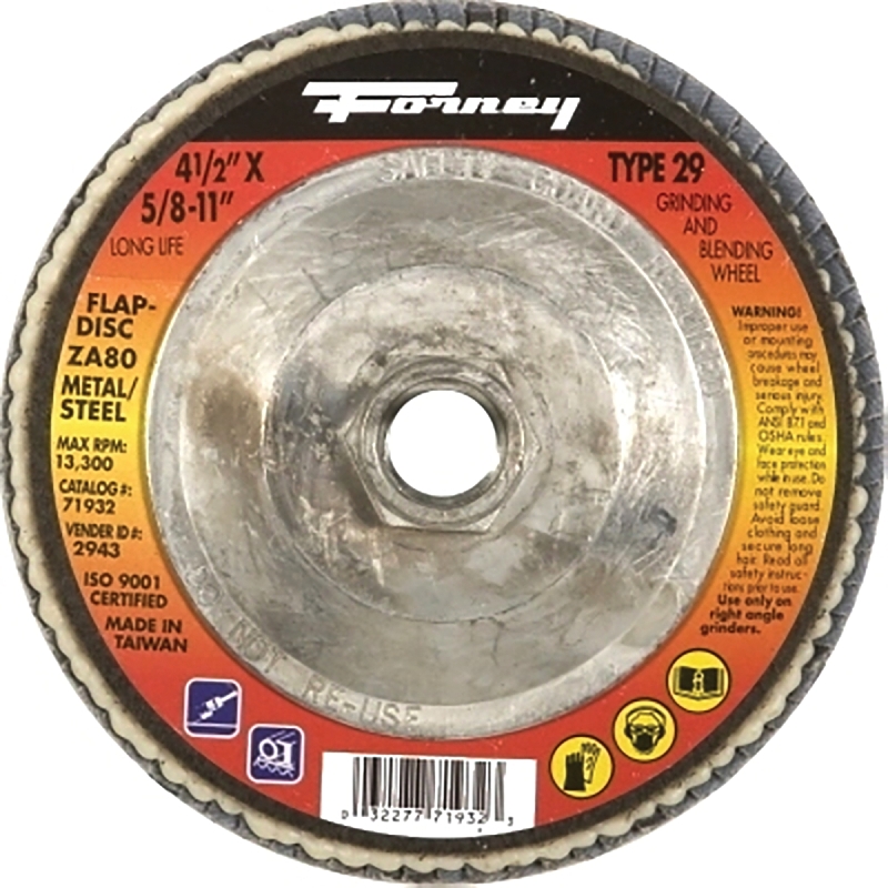 4-1/2 in with 5/8-11 arbor. For right angle grinders. Cuts fast and outlasts sanding discs. Great flexibility. Ideal for rough or fine finishing. Multiple layers of zirconia cloth flaps constantly exposing new extra sharp grinding points. Laminated by state-of-the-art automated equipment. Reinforced fiberglass backing plate. Each disc balance tested for vibration-free grinding/finishing. Wheel size: 4-1/2 in, arbor 5/8-11, maximum rpm: 13,300, tool type: right angle grinder.