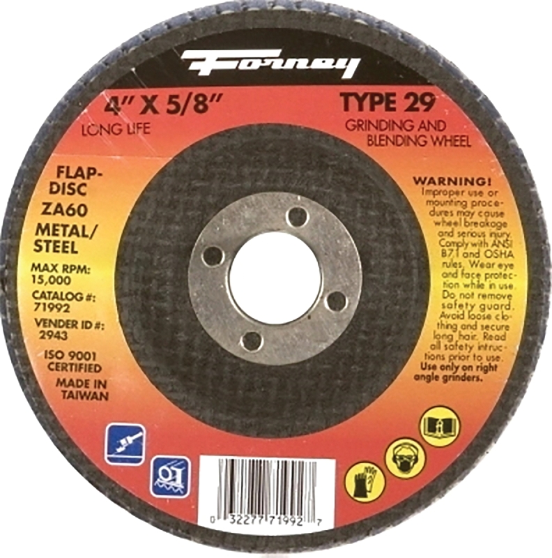 Forney 71992 Flap Disc, 4 in Dia, 5/8 in Arbor, 60 Grit, Medium, Zirconia Aluminum Abrasive, Fiberglass Backing
