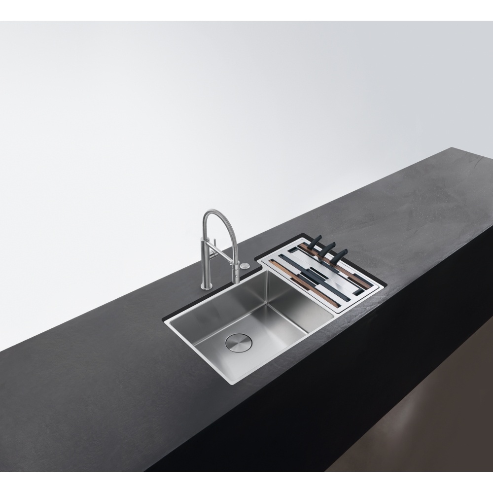 35.19-in. x 21.38-in. 19 Gauge Stainless Steel Double Bowl Kitchen Sink. Culinary Center was designed for the way you work in your kitchen, rinsing, chopping, dicing and slicing are a snap when the right tools are at hand. Every accessory included and built-in to put everyday tools at your fingertips as you work, this double-sink workstation makes a magnificent transformation to a clean, modern statement in elegance. The custom-fitted accessory compartment allows you to store the tools used most so they are ready when you need them.