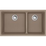 33.0-in. x 18.94-in. Undermount Fragranite Double Bowl Low-Divide Kitchen Sink. Maris sinks are equipped with deep capacity bowls. The double bowl design allows you to multi-task with ease, while the low divide creates a larger single bowl perfect for cleaning oversized cookware and bakeware. With our easy-to-use integrated ledge system, you’ll accomplish more with your sink while making the most of your surrounding counter space. The rear drain maximizes the usable surface of the bowl and creates extra cabinet space beneath the sink. Maris Fragranite sinks are scratch-resistant, fade-resistant, and impact resistant and will retain their new appearance for years. Sink strainer assembly included.