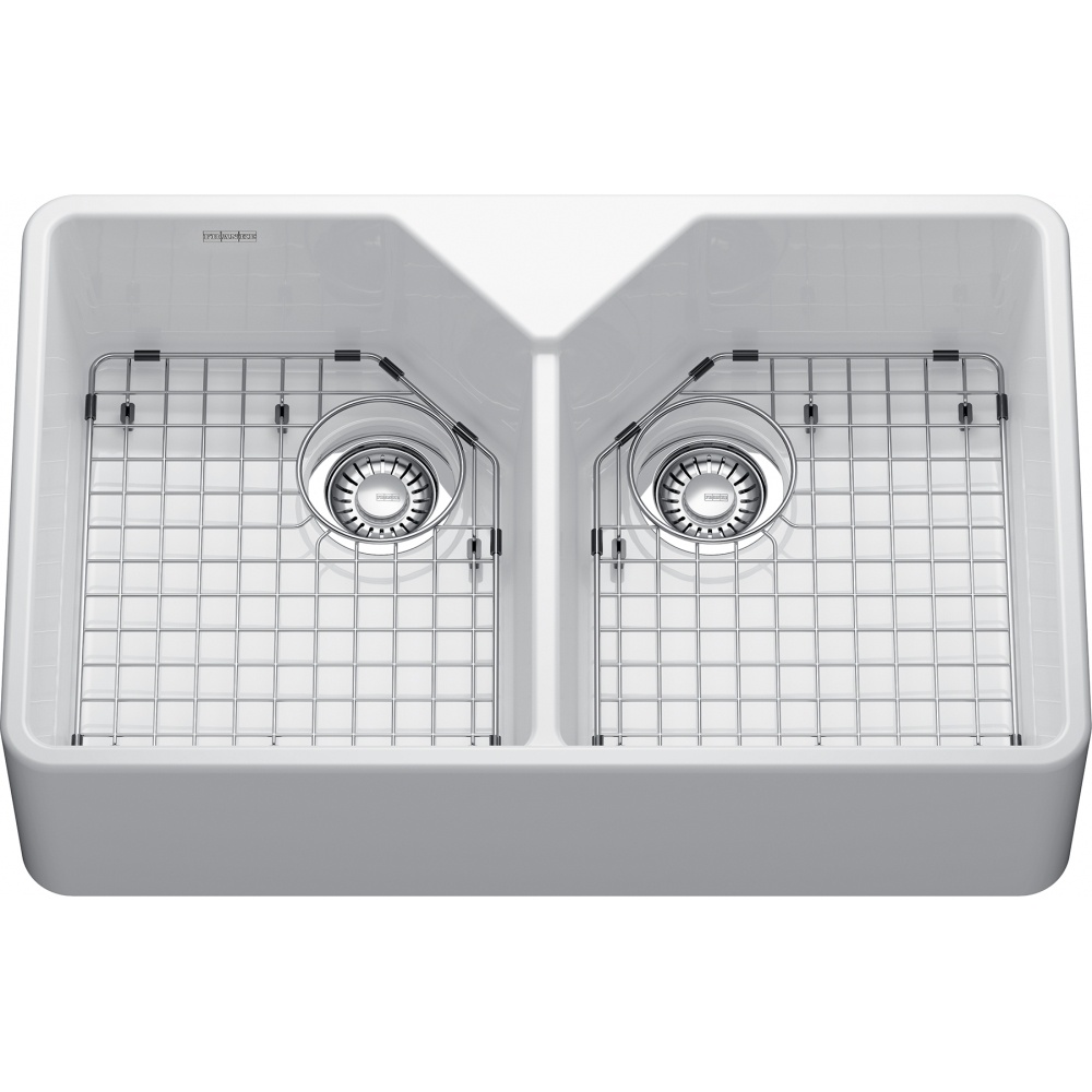 31.2 -in. x 19.2-in. White Ceramic Double Bowl Apron Front Kitchen Sink. This new Manor House sink easily combines traditional apron design with clean square lines for a modern twist. The enormous volume of the bowls lets you wash big pots and pans and prepare large food items like fish and vegetables.