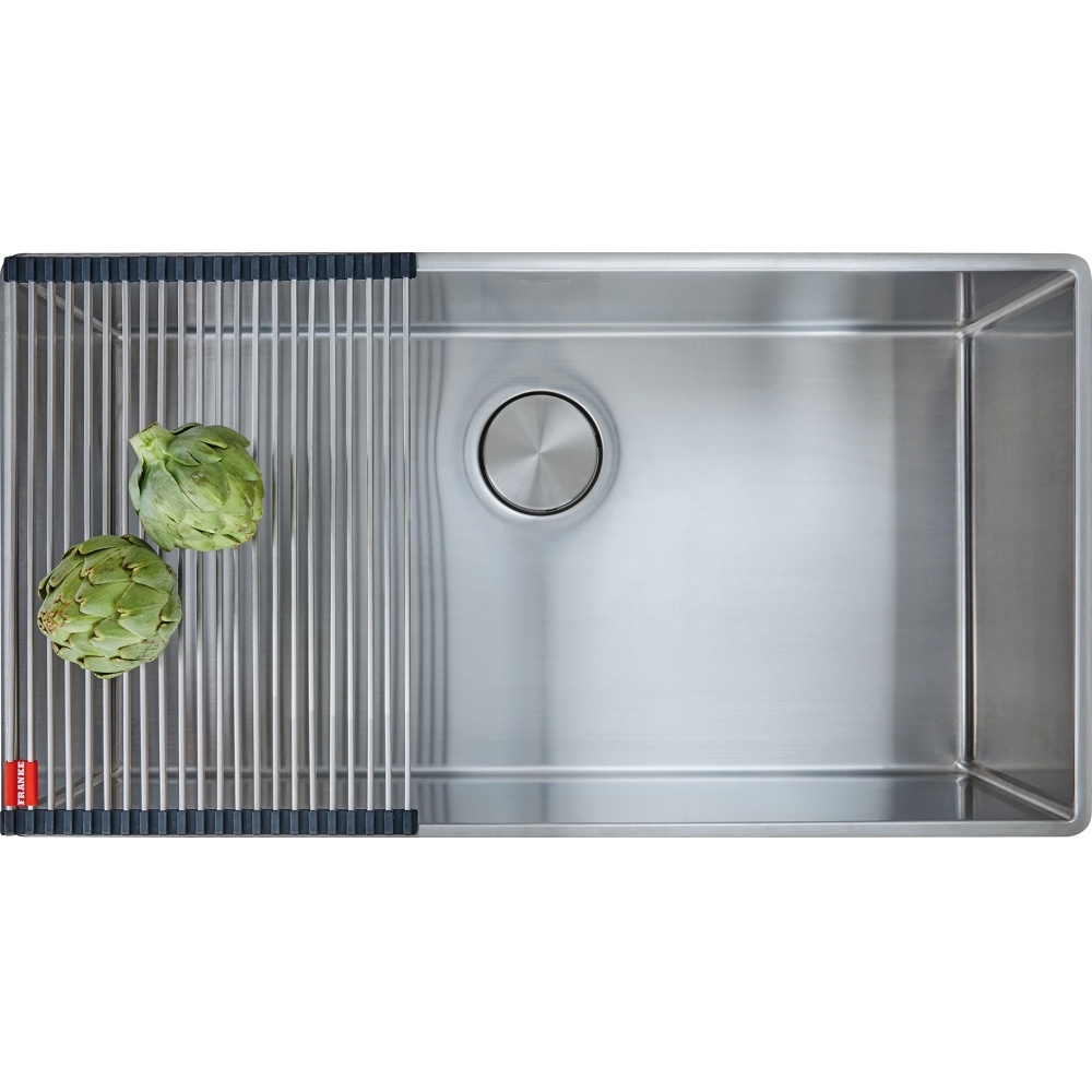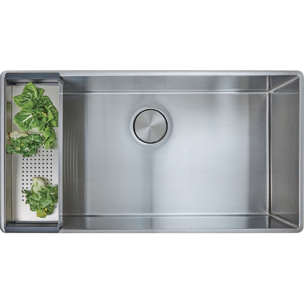 32.5-in. x 19.5-in. 16 Gauge Stainless Steel Undermount Single Bowl Kitchen Sink The Professional sink collection boasts refined touches for the home chef. Deep bowls are undermounted with a 0.5-in reveal so that custom-fit accessories can work within the sink to create a seamless workflow while prepping meals. Made of 16-gauge commercial- grade stainless steel with a beautiful Diamond finish that takes minimal care to maintain a clean, attractive look. The removable drain cover was designed to sit flush over the drain to keep glassware from tipping over and to maximize the usable bottom surface of the bowl. Bottom Grid, Strainer Assembly and Drain Cover included.