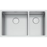 32.5-in. x 19.5-in. 16 Gauge Stainless Steel Undermount Double Bowl Kitchen Sink. The Professional sink collection boasts refined touches for the home chef. Deep bowls are undermounted with a 0.5-in reveal so that custom-fit accessories can work within the sink to create a seamless workflow while prepping meals. Made of 16-gauge commercial- grade stainless steel with a beautiful Diamond finish that takes minimal care to maintain a clean, attractive look. The removable drain cover was designed to sit flush over the drain to keep glassware from tipping over and to maximize the usable bottom surface of the bowl. Bottom Grid, Strainer Assembly and Drain Cover included.