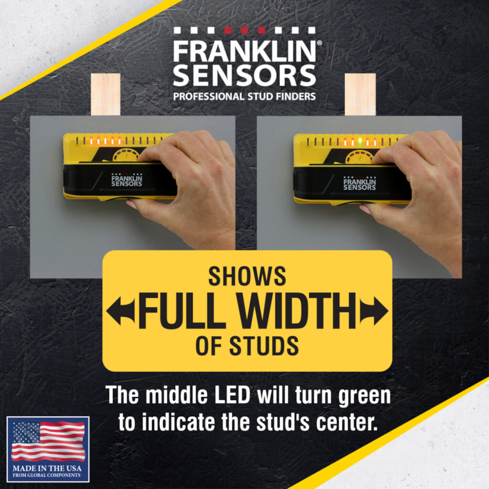 Its precision LED display (15 LEDs) shows the full width of studs, including double studs and irregular configurations that many stud finders can miss. For safer work, it also includes a live wire meter, and the center stud indicator makes fastening more accurate—the middle LED turns green when you’ve found the stud’s center. With a 1.5″ detection depth and Made in the USA build quality, the ProSensor M155 is a dependable upgrade for pros and DIYers alike.