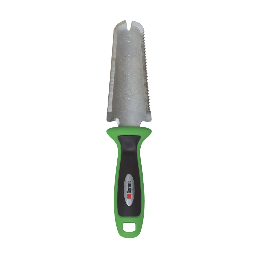The Garant 6-in-1 Garden Tool combines a twine cutter, slicer, weeding tip, ruler, planter, and cutting tool in one compact design, with a durable carbon steel head, non-slip ergonomic grip, and hanging hole for storage.